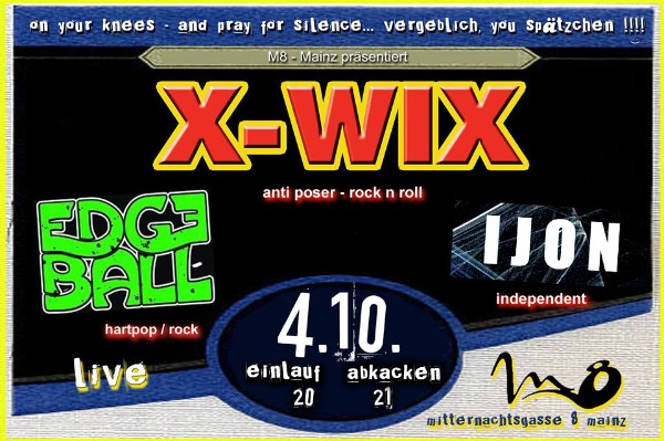 Die örtliche Erdbebenwarte ist schon informiert : X-WIX rollen an ! Das beschauliche Örtchen Kriftel im Taunus - ist bestens gerüstet ! ( Laut Aussage vom Bürgermeister - am 24.10. ! Mal abwarten, hehe ! ;) ) Mit im Schlepptau sind die geilen Bands Freibier und Handkäs Ede und die Brezelmänner !