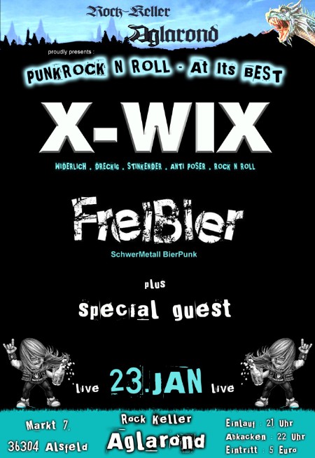 Am 23.01. also werden wir den rockkeller aglarond auf seine statischen Erbauerqualitäten testen... ! Mit zum Bautrupp gehören - unsere alten Freunde von FreiBier und eine noch nicht bekanntgegebene Band - also nen Special Guest - und das wird ein wahrer Special Guest sein - watet ab, - trinkt euch warm - bis balden ! Cheers !