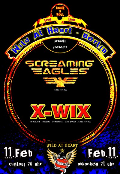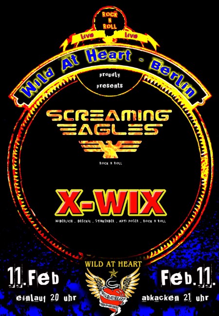 Hier sind mal 5 Pics von der Show am 11.Februar im Wild At Heart, Berlin ! War HAMMERMÄßIG GEIL !!!! MEGA FETT bei euch gewesen sein zu dürfen - BESTEN DANK auch nochmal ! ( Immerhin spielten hier auf der Bühne schon so geile Bands wie zum BSP : THE DAMNED und CJ Ramone von den RAMONES !!!! ) Und ALL THE BEST auch to the SCREAMING EAGLES aus Irland - was NICE TO MEET you ! :) Auch einen LIEBEN DANK an das BAXPAX Hostel respektive an den lieben Portier, - der uns netterweise eine coole Youtube-Session ermöglich hat ! :) Gepennt haben wir dann aber irgendwie doch net... komisch....? Ne ! hehe )