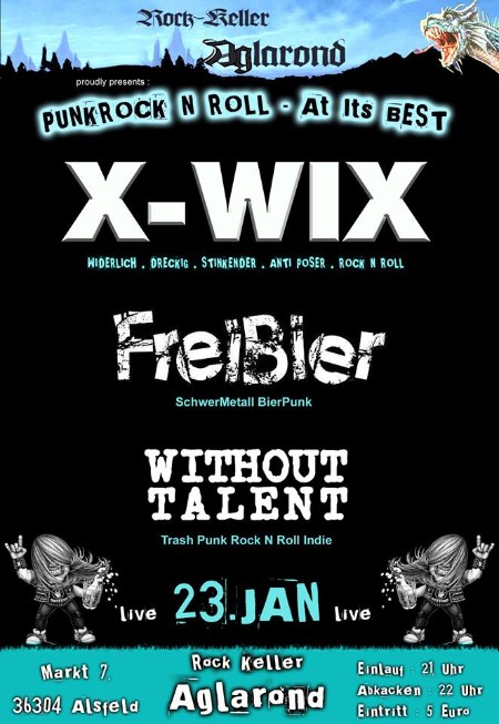 Als 3. Band an diesem Abend, - werden neben X-WIX und Freibier - dann nun auch noch die begnadeten Without Talent - mit uns rocken ! ( Gute Fahrt an ALLE - ist ja bissel glatt ! )
